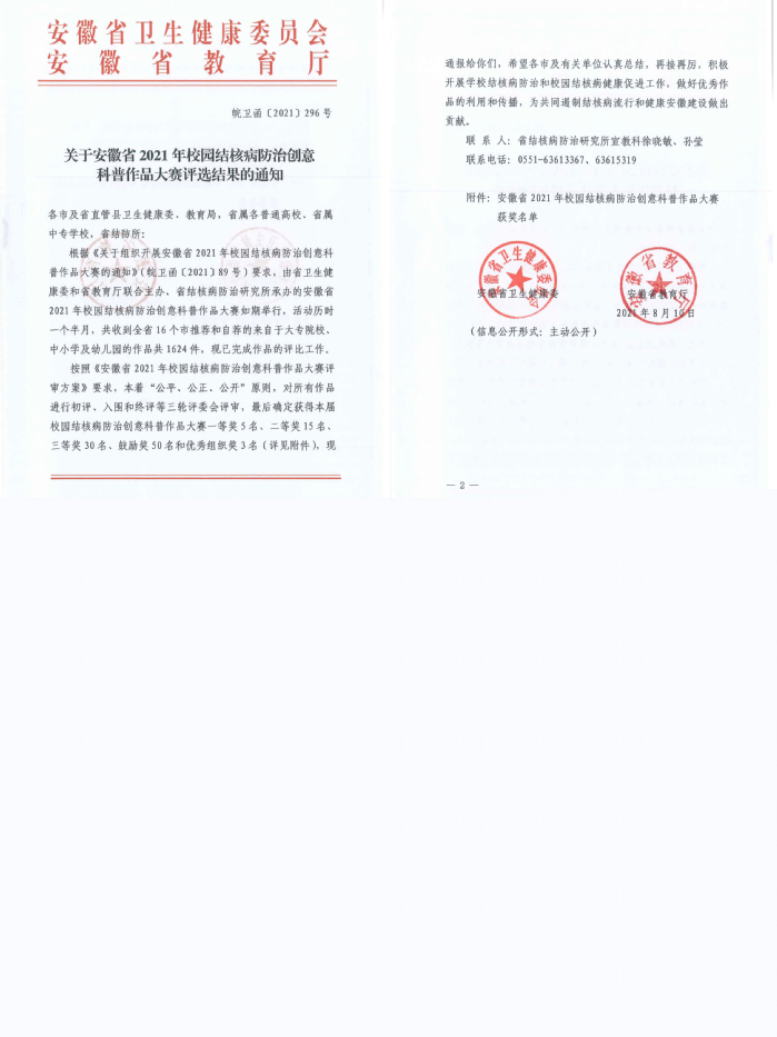 近日,由安徽省衛(wèi)生健康委員會和安徽省教育廳聯(lián)合舉辦的安徽省2021年校園結(jié)核病防治創(chuàng)意科普作品大賽評選結(jié)果公布,我校學(xué)子創(chuàng)作的參賽作品榮獲二等獎1項、鼓勵獎2項。