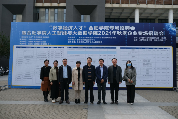 為推動畢業生更加充分更高質量就業,10月26日,人工智能與大數據學院于圖書館一樓就業招聘大廳走廊舉辦 “數字經濟人才”合肥學院專場招聘會暨人工智能與大數據學院2021年秋季企業專場招聘會,本次招聘會得到了合肥市數字資源局的大力支持。合肥市數據資源局三級調研員申林,我校黨委委員、學生工作部部長朱濤,人工智能與大數據學院黨委書記牛欣、院長檀明、黨委副書記儲昭輝到現場檢查指導工作。