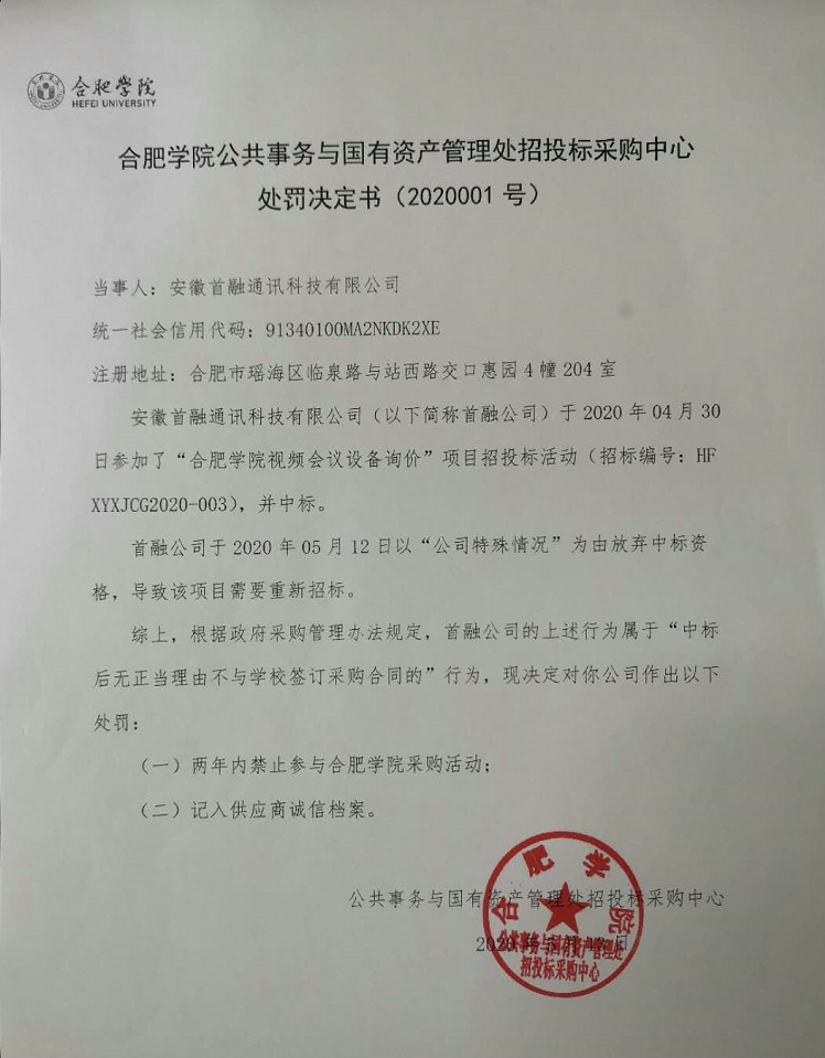 合肥學院視頻會議設備詢價項目(項目編號:HFXYXJCG2020-003)于2020430日開標,中標供應商為安徽首融通訊科技有限公司(以下簡稱首融公司),該公司于2020512日向我校投遞棄標函,根據學院相關規定,該項目作流標處理。