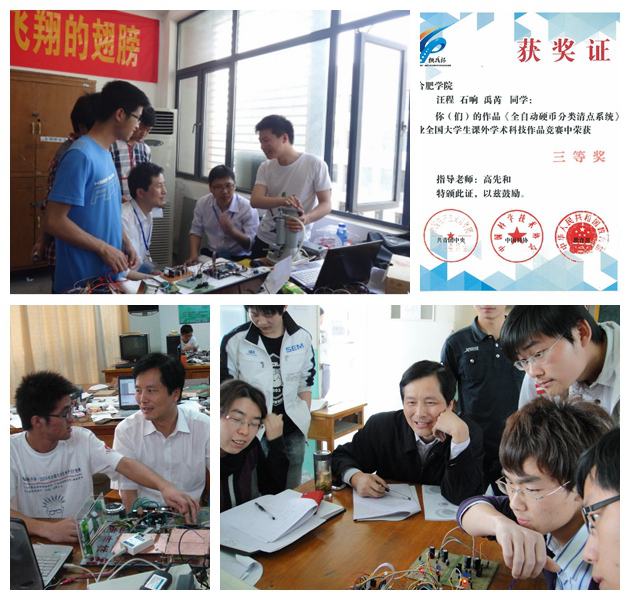 說起自己學(xué)生的成績(jī),高先和便滔滔不絕,沒有什么比看到學(xué)生們?cè)谝淮未胃?jìng)賽中斬金奪銀更加驕傲自豪的事。2009、2013年獲得全國大學(xué)生電子競(jìng)賽一等獎(jiǎng),省內(nèi)一等獎(jiǎng)?wù)急扰旁谇傲?。在這些作品中,不乏被新華網(wǎng)、新安晚報(bào)等多家媒體爭(zhēng)相報(bào)導(dǎo)的智能創(chuàng)新成果,如“硬幣清點(diǎn)系統(tǒng)”利用傳感器技術(shù)、根據(jù)硬幣的材料不同判斷其真假并進(jìn)行分類,降低了許多假幣損失,為公交車和銀行省了不少麻煩,有很好的市場(chǎng)前景?!爸悄艹小笔菇Y(jié)賬只需要幾秒鐘;“聰明座椅”讓學(xué)生徹底告別早起占座。如今,高先和將團(tuán)隊(duì)工作室搬到同學(xué)們的研究地,讓同學(xué)們參與產(chǎn)品設(shè)計(jì)的全過程,熟悉研發(fā)的必要科學(xué)環(huán)境。2013級(jí)電子信息工程系電協(xié)會(huì)長(zhǎng)汪程同學(xué)表示,老師們的項(xiàng)目經(jīng)驗(yàn)讓自己在參加學(xué)科競(jìng)賽少走了不少彎路。因?yàn)楦呃蠋煱滋煊薪虒W(xué)任務(wù),所以經(jīng)常凌晨三點(diǎn)多,這里還是燈火通明,師生們還在互相交流、修改完善項(xiàng)目。
