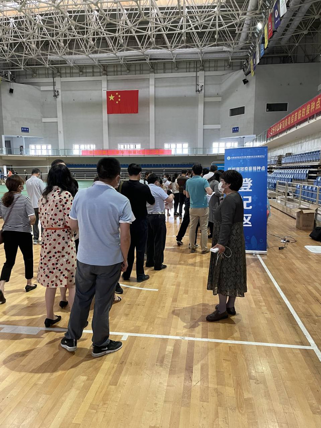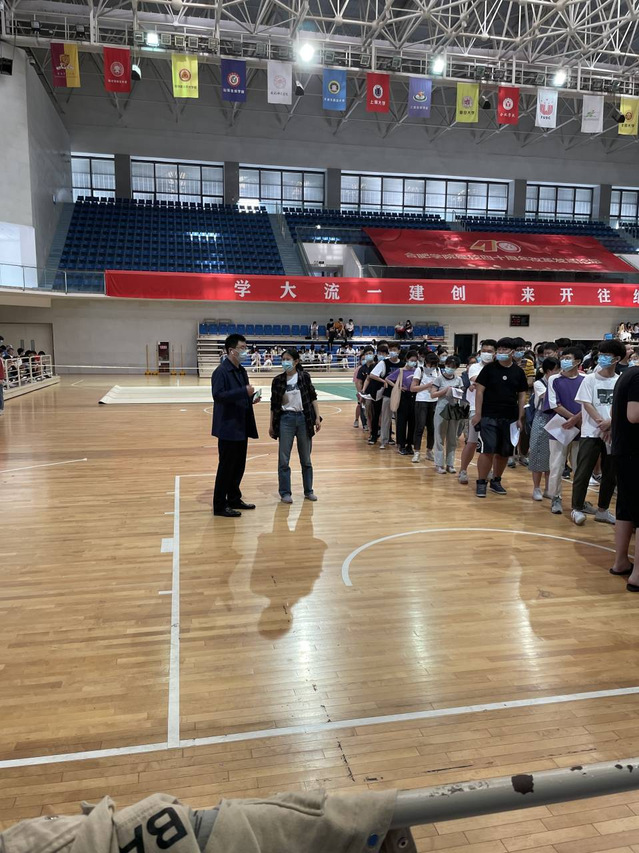 528早上,我院黨委副書記李秀娟以及全體輔導員均到達接種現場,體育館接種點外早早就排起了長長的隊伍,同學們戴好口罩,都踴躍地加入到了主動接種的大部隊當中。大家對參加疫苗接種都很期待,都表示這是作為一名中國人享受的國家福利,也是作為一名青年大學生為社會應盡的一份責任。各部門教職工們也在隊伍中來回穿梭,告訴大家接種流程。