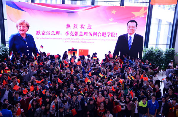 10月30日上午,合肥學院全體師生熱情高漲,校園內歡呼聲此起彼伏。國務院總理李克強與德國總理默克爾共同參觀了合肥學院。
