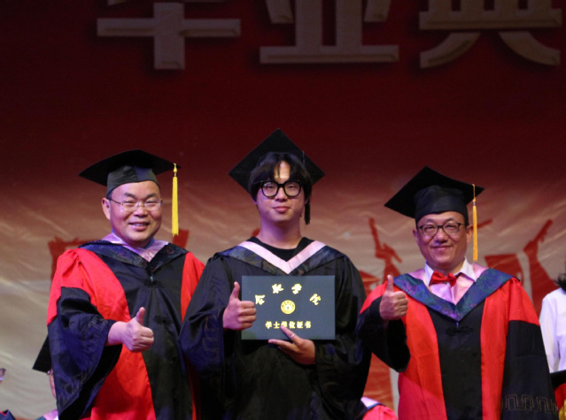 發(fā)言結(jié)束后,學(xué)院黨委書記倪澤強、院長陳江華上臺,為2023屆畢業(yè)生頒發(fā)證書,撥流蘇,并合影留念。