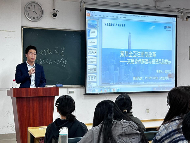 接下來,吳文濤先生就全面注冊制下適當(dāng)性制度解讀”“交易規(guī)則解讀交易風(fēng)險(xiǎn)與機(jī)遇這三點(diǎn)分別進(jìn)行了詳細(xì)分析和說明,讓學(xué)生們更好應(yīng)對(duì)市場變化與波動(dòng),吸收不同投資領(lǐng)域的知識(shí),學(xué)到更多的投資技能。