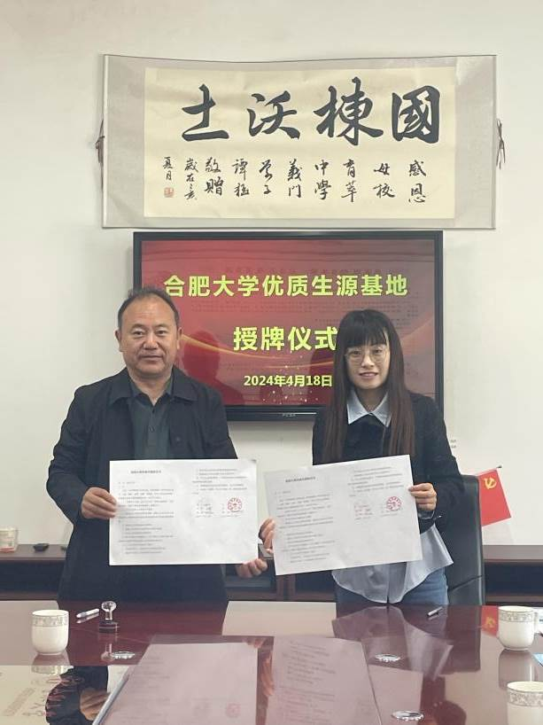 為積極發(fā)揮高校學(xué)科與人才培養(yǎng)優(yōu)勢(shì),進(jìn)一步加強(qiáng)高校與中學(xué)的交流合作,2024年4月18日上午,經(jīng)管學(xué)院與先進(jìn)制造學(xué)院前往安徽省渦陽(yáng)縣育萃中學(xué)和渦陽(yáng)縣第一中學(xué)進(jìn)行“優(yōu)質(zhì)生源基地”簽約授牌儀式。經(jīng)濟(jì)與管理學(xué)院副院長(zhǎng)于娜、先進(jìn)制造工程學(xué)院黨委副書(shū)記蔡靈美、育萃高中許昆副校長(zhǎng)、尉言鵬主任以及渦陽(yáng)一中校長(zhǎng)袁馳、副校長(zhǎng)盛偉民等相關(guān)領(lǐng)導(dǎo)參加儀式。