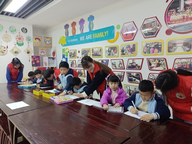 團體心理輔導活動中,心理志愿服務隊成員首先帶領小朋友們進行了“蘿卜蹲”熱身游戲活動,活躍了活動的氛圍,孩子們之間的關系得到了小小的“破冰”。游戲結束后,團體心理輔導活動正式開始,志愿者們開始介紹本次活動的主題是“分享快樂”。通過游戲“快樂的假期”,讓孩子們回憶自己記憶最深刻的快樂假期時光,希望孩子們在白紙上畫出自己的快樂時光。繪畫環節中志愿者們負責維持活動秩序,并協助孩子們進行繪畫。