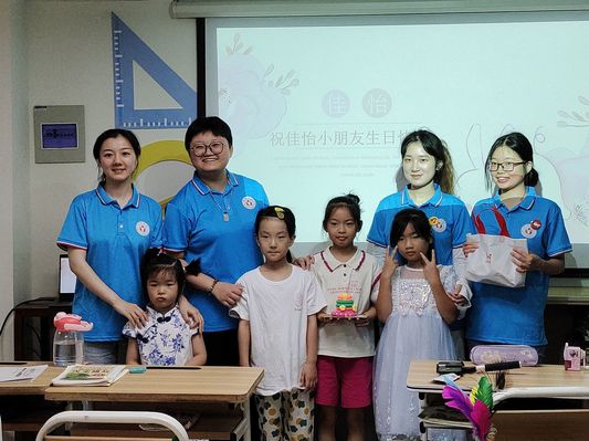按下的快門合照也折射出孩子們五彩斑斕的記憶。團隊成員王欣悅放映了她為小朋友制作的生日祝福幻燈片,并且和在場的其他成員一起帶領著小朋友共同為沈佳怡歌唱《祝你生日快樂》。教室溫馨的氛圍在音符的跳動中更是添上了一抹活躍的色彩。團隊成員還為佳怡小朋友送上了小零食,表達了真摯的祝福,希望她能夠健康快樂地成長?;顒拥淖詈螅驹刚邆兣c小朋友一同合影留念,記錄下這個美好的瞬間。