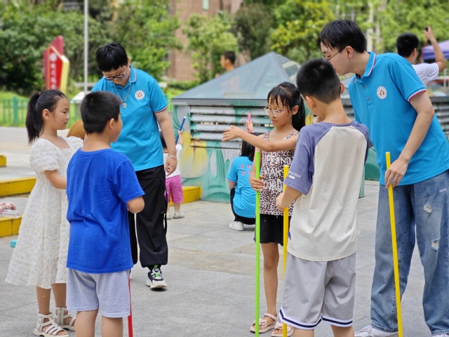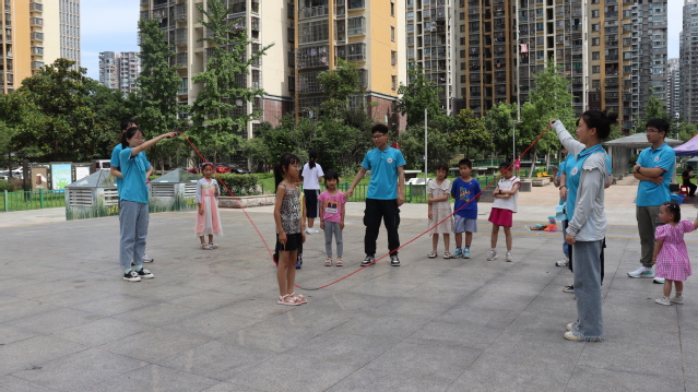 7月8日下午,合肥學(xué)院教育學(xué)院“七彩童年,‘育’你相伴”三下鄉(xiāng)社會實踐團隊于合肥濱湖和園社區(qū)開展了一次趣味運動會。本次課程由志愿者李碩碩擔任主講教師,志愿者沈葉天擔任助教。 人皆苦炎熱,我愛夏日長。孩子們期待已久的趣味運動會如期而至,主講教師李碩碩的講解規(guī)則后,趣味運動會就此拉開了序幕。一聲令下,已經(jīng)被分成三組的孩子們依次跳進搖動的繩索中,隨著繩子打在地上均勻而有力地拍打,孩子們?nèi)缪嘧影闵舷绿S。盡管有時跳繩會“卡殼”,但孩子們也始終洋溢著笑容。這也正是老師所希望帶給孩子們的,通過游戲,培養(yǎng)孩子良好的意志品質(zhì)和團結(jié)協(xié)作的精神。第二個項目兩人三足也隨之紛至沓來,孩子兩兩組隊,齊頭并進,勇往直前。熱鬧的場面、緊張的氛圍、急切的心情使個別組合亂了陣腳,有的組合摔倒后經(jīng)短暫的調(diào)整后又繼續(xù)前行;有的組合喊著“1、2!1、2!”口號邁出整齊步伐;有的組合配合頗有默契,跑得飛快,把對手遠遠地拋在身后……兩人三足拼的不僅僅是速度,更是兩人之間的默契與配合。二人齊心,其利斷金。老師希望在比賽中,兩個孩子能夠默契合作,保持平衡和節(jié)奏,以此提升孩子們之間的感情,明白“獨腳難行,孤掌難鳴”的道理,激發(fā)團體意識與集體責任感。