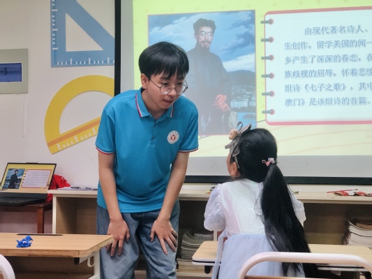 “你可知‘MACUA’不是我真姓,我離開你太久了,母親……”志愿者娓娓動聽的歌聲響起,孩子們情不自禁地跟著志愿者打著節拍,輕聲歌唱。為了讓孩子們領悟這首歌曲背后雋永的情感,更好地學習這首歌,志愿者為孩子們講解了這首歌曲的創作背景與歌詞內容。志愿者告訴孩子們“七子”是當時中國被列強霸占的七塊土地,澳門是其中之一,詩人聞一多留學歸來,放眼祖國家園,山河破碎,斷壁殘垣,他憤然寫下著名的愛國詩篇《七子之歌》,以抒發七子的孤苦亡告和眷懷祖國的哀忱。聽志愿者娓娓道來,孩子們不禁都紅了眼眶。山河的破碎、先輩的熱血、閃耀的紅星都仿佛出現在眼前。