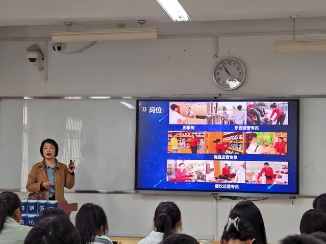 宣講會上,顧部長從“走進華強、蕪湖方特旅游度假區(qū)、快樂在方特”三個方面展開介紹。首先,顧部長詳細介紹了華強集團,特別是華強集團隸屬的8家企業(yè),并邀請在座的同學前往華強集團工作。其次通過PPT向大家介紹了蕪湖方特主題樂園的發(fā)展狀況、已有的四期主題樂園及各期公園的特點和特色項目。隨后,顧部長還為大家詳細介紹了實習的內(nèi)容、工作環(huán)境、福利待遇及要求等,并為學生們答疑解惑。顧部長引用方特的主題“方特成就歡樂夢想”結(jié)束了宣講會。