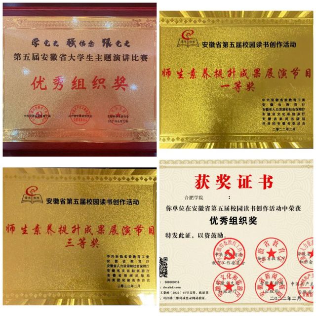 在讀書創作活動中,王欣悅同學被評為“讀書創作之星”,她的作品《漫山遍野映山紅》獲特等獎;在“謳歌百年輝煌歷程”文藝短視頻比賽中,李慶鋒同學的沙畫《百年輝煌歷程》獲得一等獎;在第五屆安徽省大學生主題演講比賽中,張遠想同學獲得本科組一等獎(第二名);在第三屆中華經典誦寫講大賽安徽省預選賽中,張昊、張佳駱、張瀚程等同學的作品《月光下的中國》獲一等獎。魯世秀、毛紅星、丁婧等五位老師獲評“優秀指導老師”,我校分別獲得第五屆安徽省大學生主題演講比賽、第三屆中華經典誦寫講大賽安徽省預選賽和讀書創作活動三個比賽的優秀組織獎。眾多獎項的獲得是我校校園文化建設的優秀成果之一,體現了我校師生優秀的人文素養和綜合素質。