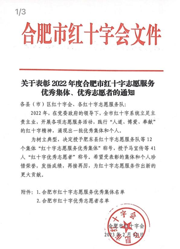 為樹立典型,進一步踐行“人道、博愛、奉獻”的紅十字精神,合肥市紅十字會通報表彰了2022年度合肥市紅十字志愿服務優秀集體及優秀志愿者,我校大學生紅十字會榮獲“合肥市紅十字志愿服務優秀集體”稱號,我校林婷芳和劉佳樂兩位同學榮獲“合肥市紅十字優秀志愿者”稱號。