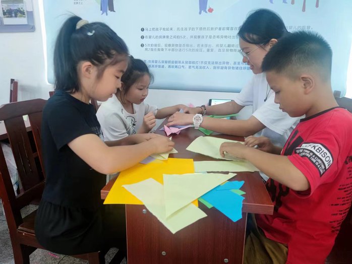 7月18日,同學(xué)們又去往五龍社區(qū)開展垃圾分類主題的公益課堂,耐心地指導(dǎo)每一個孩子進行折紙,豐富了兒童的課余生活。在霞澗社區(qū),同學(xué)們不僅開展公益教學(xué),為留守兒童獻愛心,還與社區(qū)干部進行座談開展黨紀學(xué)習(xí)教育,強化了社區(qū)的凝聚力,營造了良好的文化氛圍。